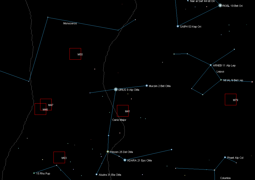 The Fourth GroupThe fourth and final group of Messier objects we’ll look at are in Lepus, Canis Major, Monoceros, and Puppis. It’s a bit harder to orient yourself generally to this group of objects, because there’s a lack of nearby bright guide stars. But finding the base of Orion—Rigel and Saiph—and Sirius in Canis Major puts you in the right general area, and those are easy to find. We’ll get into more details later about how to locate the individual objects. 480: Lepus, Canis Major, Monoceros, and Puppis Overview This fourth group also comprises six Messier Objects, all clusters. There’s a globular cluster, M79, in Lepus, and five open clusters—M41 in Canis Major, M50 in Monoceros, and M46, M47, and M93 in Puppis. We’ll start with M79 in Lepus, which is the only globular cluster among the Winter Messier Objects. |