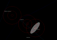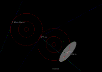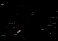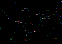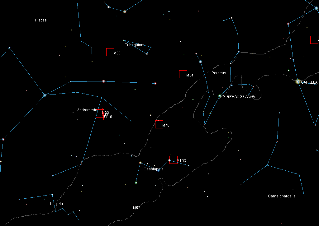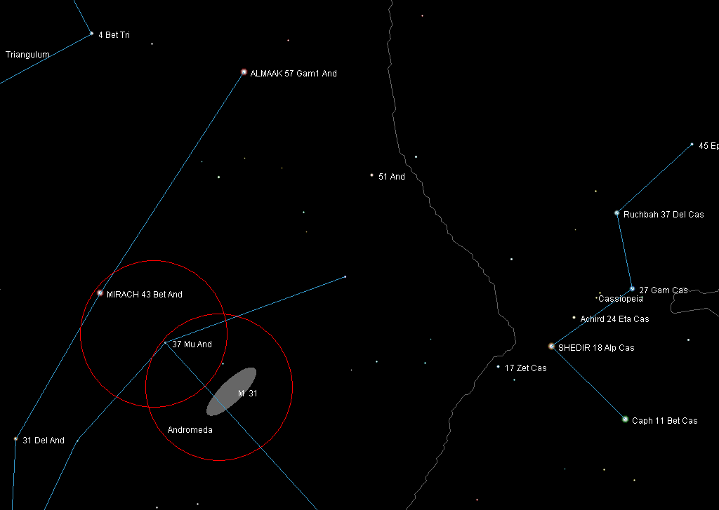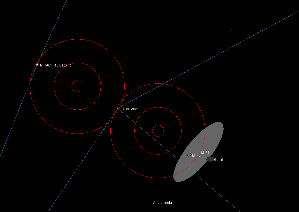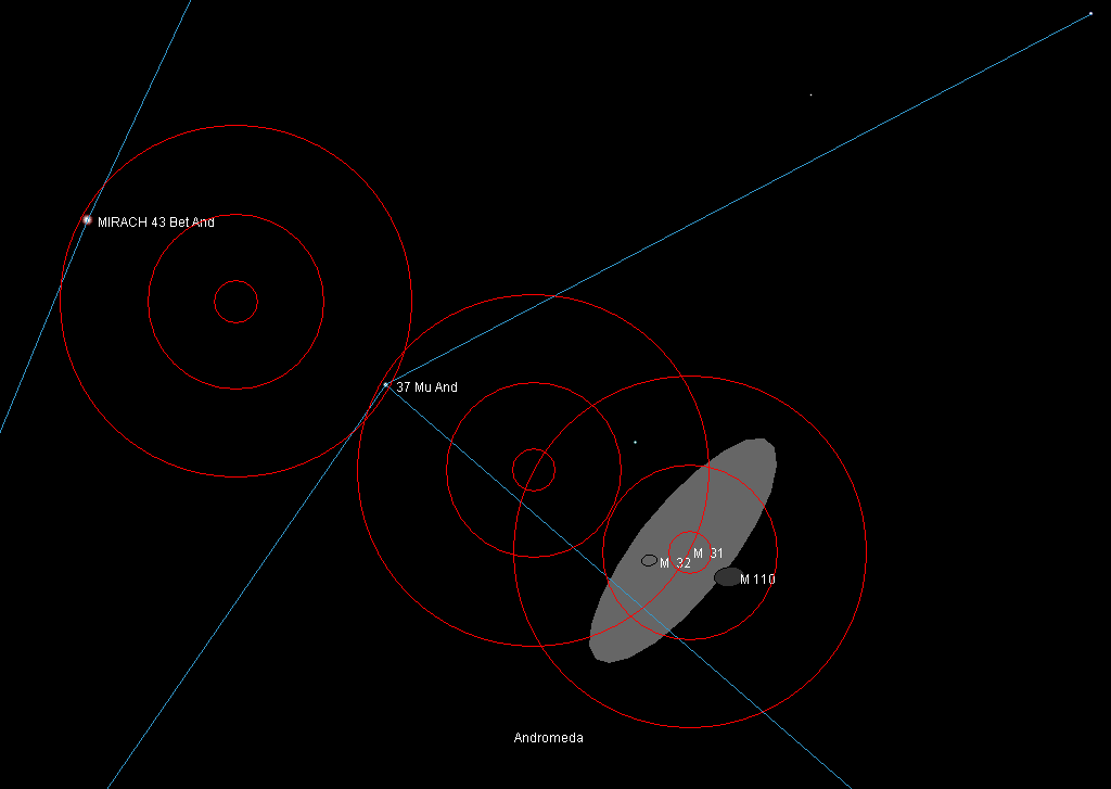 To reach 104X in his 6” f/60 reflector, Messier must have used an 88mm focal length eyepiece. Actually, that’s deceptive, because back then few telescopes had interchangeable eyepieces. In those days, if you needed a different power or field of view, you bought another telescope. Incidentally, although a 6” reflector may sound like an impressive instrument, reflectors back then used speculum metal, which even when new is much less reflective than today’s aluminum or silver coatings, and tarnishes very quickly. A 6” speculum-metal scope is about the equivalent of a 3.5” or 4” reflector nowadays. From a dark-sky site like the Parkway, Andromeda is easy to spot naked eye. From a light-polluted site like Bullington, Andromeda can be hard to find if you’ve never found it before. Once you do find it, though, you’ll never have any problem finding it again. The Astronomical League rates M31 “Easy” with 7X50 binoculars, although they rate M32 a “Challenge” and M110 as not visible. To find M31 with binoculars, the first step is to find Mirach, which is beta-Andromedae, the second brightest star in the constellation Andromeda. To do that, let’s go back to the chart I had up a moment ago. 050: Andromeda, Cassiopeia, Perseus, Triangulum Overview You should be able to locate Cassiopeia easily. Shedir, at magnitude 2.23 the brightest star in Cassiopeia, is at the bottom right of the “W” or the top left of the “M”, depending on how you look at it. The triangle of which Shedir forms the apex points directly at Mirach (magnitude 2.06) in Andromeda. The two are separated by about 21.5 degrees, or about two fists held at arm’s length. There is no other star even remotely as bright as Mirach in that vicinity. You can verify you have the right star by looking for a clear isosceles triangle formed by the three brightest stars in the area, all of which are second magnitude. Shedir in Cassiopeia forms the apex, with Mirach and Almaak in Andromeda forming the base. Once you’ve located Mirach, finding M31 is easy in binoculars. 060: Andromeda with Binoculars The circles on this chart are 7 degrees, which matches our 7X50 binoculars. Most other 7X to 10X binoculars have 6 to 8 degree fields, so the view should be similar in your binocular. Put Mirach on the edge of the field, with most of the field skewed towards Cassiopeia and slightly away from Almaak. How much isn’t critical. Near the center of your field, you’ll see 37 Mu Andromedae. At magnitude 3.9, it’s by far the brightest star in the field other than Mirach. On the line formed by Mirach and 37 Mu Andromedae, swing your binoculars about half a field away from Mirach, until 37 Mu Andromedae is just on the edge of the field. M31 should be about centered in your view. M110 won’t be visible in your binocular. With averted vision, M32 may be marginally visible as a bright knot on the edge of M31. Once you’ve found M31 with binoculars, it’s not hard to find it with your scope.070: Andromeda with Telrad To begin, point your Telrad so that Mirach is on one edge of the 4 degree circle and 37 Mu Andromedae on the other. Pivot your scope on the line formed by those two stars to put 37 Mu Andromedae on the far edge. 080: Andromeda with Telrad Once you have 37 Mu Andromedae on the edge, continue on the same line half a Telrad field. M31 should be about centered in your optical finder. If you’re using a low-power eyepiece, M31 should also be about centered in the eyepiece. In your main scope, M31 should be visible as a moderately bright central gray fuzzy, surrounded by darker gray fuzz. Depending on how wide your field of view is, you may need to pan around a bit to find M32 and M110, but you should be able to get all three in one field of view if your eyepiece gives you at least one and a third degrees or so. M32 will be visible as a brighter knot on the edge of the M31 nebulosity. M110 will be visible as a dimmer patch with a distinct oval form to the opposite side of M31. Regardless of the size of your scope, you’ll be able to see more detail if you use averted vision. Time constraints mean I have to move along quickly, but I hope you’ll spend some time with the Andromeda galaxies. If you have a moderate to large scope, you can easily spend an hour or more on M31 alone, and still be discovering additional details. |