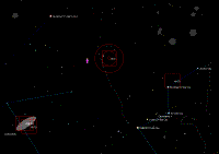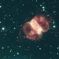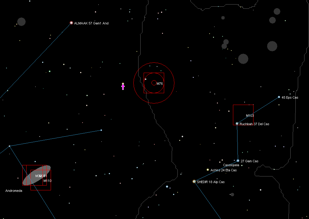 M76 (planetary nebula in Perseus)250: M76 Image M76 was discovered by Pierre Méchain on September 5, 1780, and confirmed by Messier on October 21st. M76 is commonly called the Little Dumbbell Nebula, but is also known as the Cork Nebula, Butterfly Nebula, or the Barbell Nebula. Interestingly, although M76 is a single object, it has two NGC numbers because William Herschel and other early observers assumed that it was two separate objects. Visually, M76 looks like a tiny version of M27, the Dumbbell Nebula. The main body of the nebula is a bright elliptical ring seen nearly edge-on, with the expanding gas forming the lower surface brightness wings of the butterfly. These wings—and the 16.6 magnitude central star—are visible only in the largest amateur instruments. The brighter central portion is only about 42 by 87 arcseconds, which is to say about one arcminute in extent, which is only about 1/30th the diameter of the full moon. The distance of M76 is uncertain, as is the case for most planetary nebulae. Estimates cover nearly a full order of magnitude, from 1,700 to 15,000 light years. As is common for planetary nebulae, M76 emits nearly all of its visible light in the 5007 O-III line, which means narrowband LPR filters and particularly O-III filters can be quite helpful in enhancing the contrast of the nebula against the background. M76 is the dimmest object in the entire Messier list, and is by far the hardest object to locate of any those we’re talking about tonight. Not only is it dim, but it’s tiny, it’s not conveniently near any bright guidepost stars, and it’s not visible in standard binoculars or your optical finder. M76 lies almost exactly at the midpoint of a line drawn from Almaak in Andromeda to Ruchbah in Cassiopeia. That line is almost exactly 19 degrees long, with M76 lying about half-way along the line—9 degrees from Ruchbah and 10 degrees from Almaak. 260: M76 Telrad detail The keys to locating M76 are to take the big-picture approach, use geometric relationships, and locate the relatively bright star 51 Andromedae (marked with the arrow). Once you have that star in your finder, pivot your scope 3 degrees—about half a finder field—on the line that links 51 Andromedae to 45 Epsilon Cassiopeia. M76 lies just off that line, where it will appear in your low-power eyepiece as a slightly fuzzy star. Once you have that fuzzy star centered, change to a high-power eyepiece to view the object. |