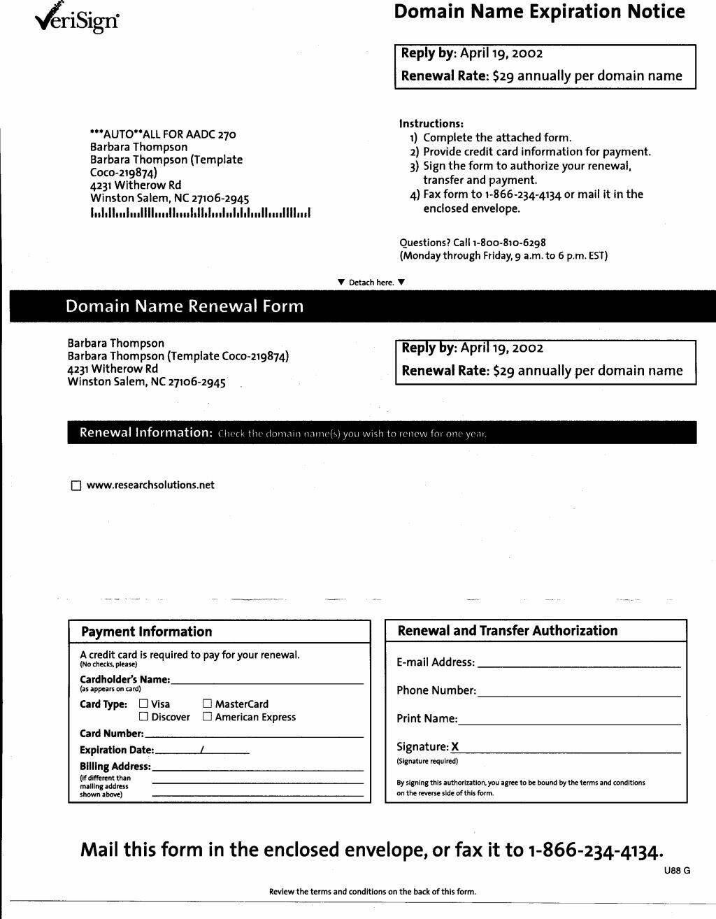 Be careful if you get a domain renewal notice from VeriSign. I got one the