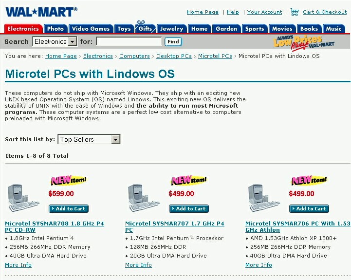 13:10 - The first crack in the dam? Wal*Mart is now shipping eight system configurations with Lindows pre-installed. Microsoft must be gnashing their collective teeth. Microsoft hates it when obscure little garage shops ship boxes with Linux installed. How much more must they hate it when a high-profile mass marketer like Wal*Mart is now advertising and shipping PCs that have no Microsoft software installed on them? Of course, Wal*Mart is rather exaggerating the capabilities of Lindows when they claim Lindows has "the ability to run most Microsoft programs" (and in bold face, yet). That's misleading at best and many would consider it a fraudulent claim. I suspect Microsoft's lawyers will be all over Wal*Mart before the day ends. I also find it odd that Wal*Mart is shipping PCs with an OS that's still in beta. When I checked the Lindows web site just now, I found that they still aren't shipping their final version. Also, I can find no link to download Lindows, which is rather strange for a Linux-based OS. Michael Robertson, the CEO of Lindows, has already drawn the ire of some OSS folks for failing to make source code available and for the Lindows End User License Agreement, which flies in the face of OSS and FSF by restricting distribution of the product. And speaking of teeth-gnashing, AMD hates it when people advertise their Athlon processors using the actual clock speed rather than AMD's hokey Performance Rating model number. I see that Wal*Mart is doing that, which won't make AMD happy.