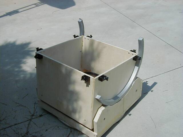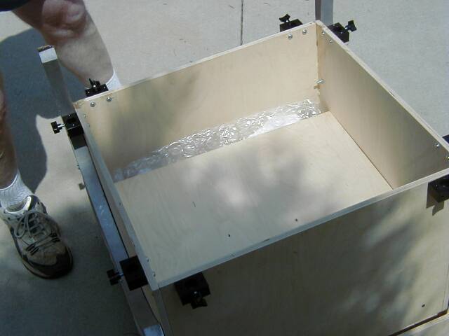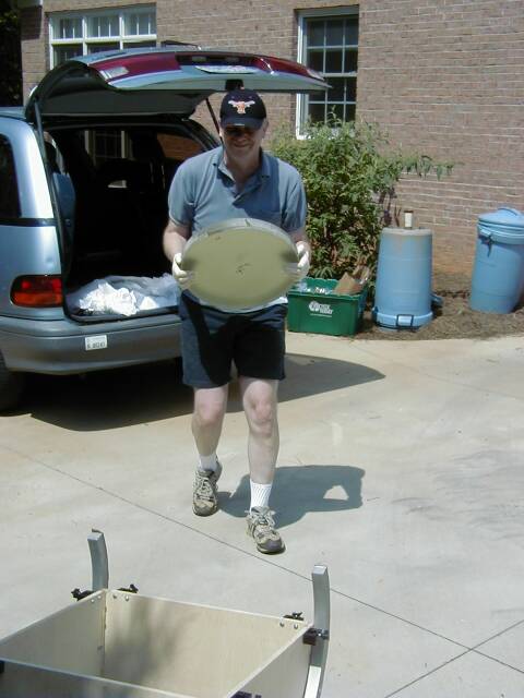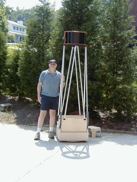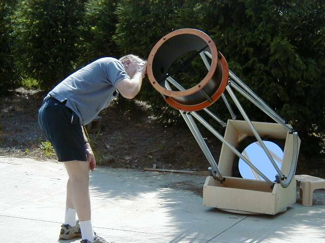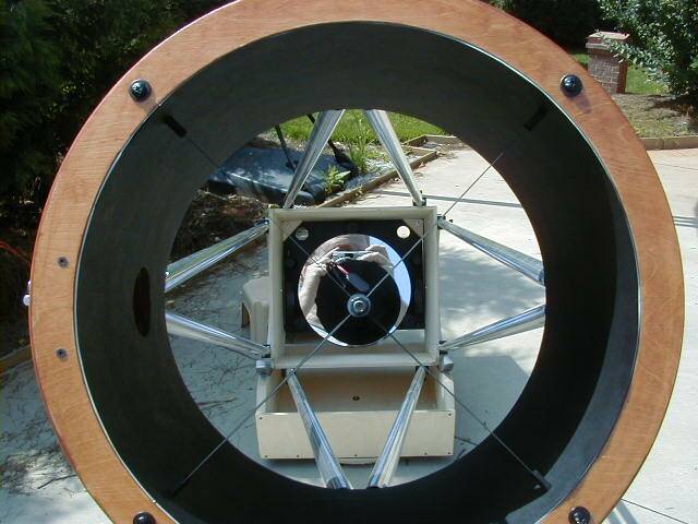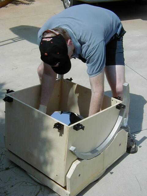 I spent some time Saturday and Sunday helping my friend Steve Childers work the new 17.5" truss-tube Dobsonian telescope he's building. Right now, Steve is trying to figure out how long to make the truss tubes that join the lower part of the scope assembly to the upper part. The mirror has a focal length of 87 inches (~ 2.2 metres), and we want the focal point at infinity to fall as exactly as possible mid-way in the focuser travel, which is only a couple inches. The trick is to get the truss tubes cut such that they're short enough, but not too short. If they're a bit too long, the scope will be able to focus on things close to it, but not at infinity. If the truss tubes are too short, the scope won't be able to come to focus on anything. Too long, we can deal with just by cutting off a bit more. Too short is a disaster, because Steve would need to get new tubes and start over. They're not stock items locally, so he'd have to order them in, which would take a month or so. Mars is at closest approach in late August, and we need some time to get the kinks worked out, so cutting them too short is not an option. Accordingly, we're using the cut-and-try method, approaching the proper length slowly. Here are some photos I took yesterday.