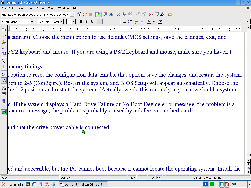 [Sunday] [Next Week] 9:23 - Final pre-production edits on the Preface and the first chapter this morning, followed by shooting cover images this afternoon. I played around some more with Xandros on the Aria system last night. It's still not working the way it should be, although I'm pretty sure the problem is Mozilla 1.6 rather than Xandros. I also tried using StarOffice 7 on the Xandros system last night to work on some of the chapter edits. Once again, I ran into the problem of Star Office (or OpenOffice.org) butchering the formatting. Here's an example. Note that StarOffice has no horizontal scroll bar and yet much of the text is off the screen to the left. There are also many other formatting glitches which aren't apparent unless you're comparing this to the original document in Word 2000. The StarOffice version is simply unusable. That's unfortunate, because I really, really want to get away from MS Office.