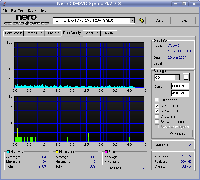 Lite-On LH-20A1S drive, Taiyo-Yuden 16X DVD+R, 8X speed setting