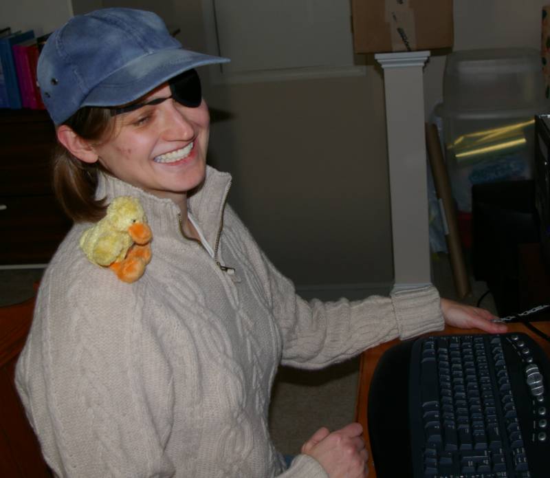 wearing a pirate eyepatch and with a parrot on her shoulder--actually,