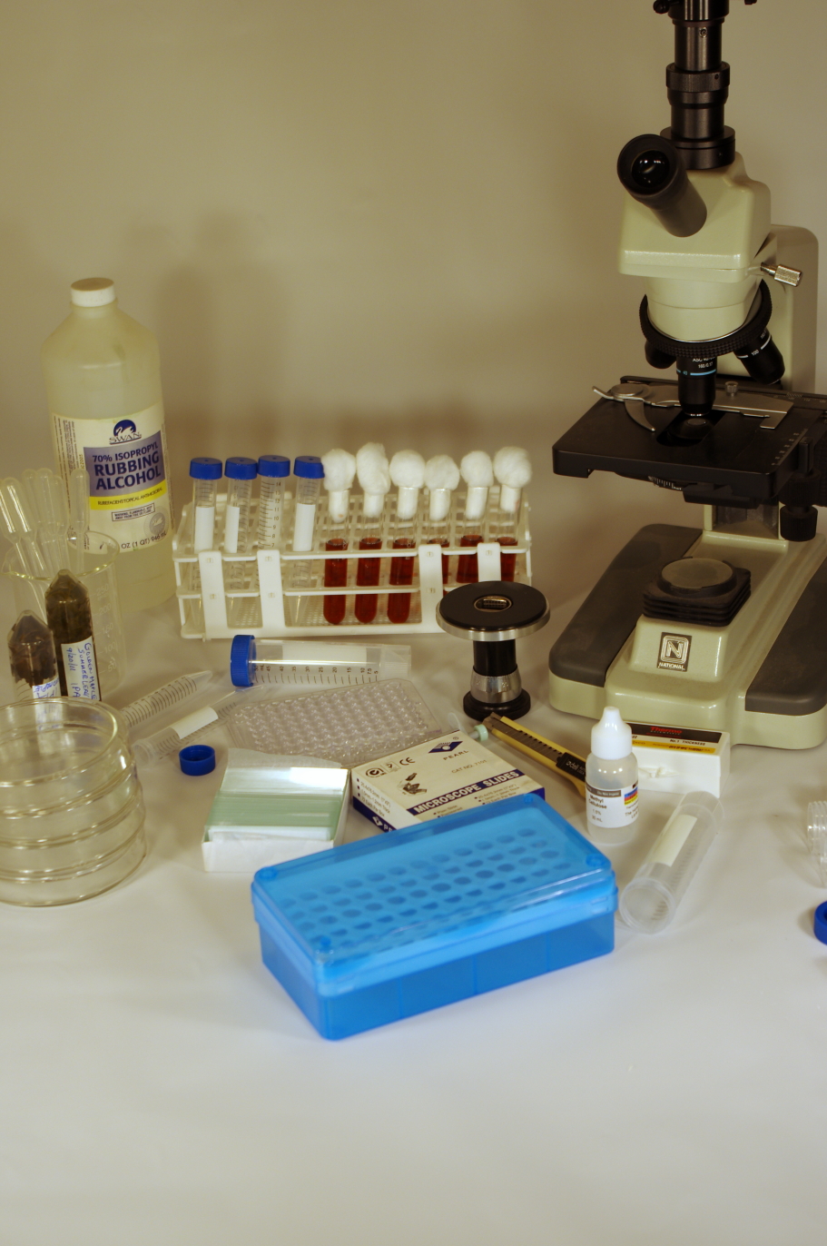 How about a circle of images, from an amoeba to a slug to a fish to a reptile to a human. The other side of the circle would have various plants, culminating in a tree. The middle of the image can have the lab equipment. Obviously that’s not something to shoot in your lab, but the internet or O’Reilly should be able to provide images licensed for this use. (Or you could use some l33t MSPaint skilz to draw up photo-realistic images. Oh, wait, you don’t use Windows. Never mind.)